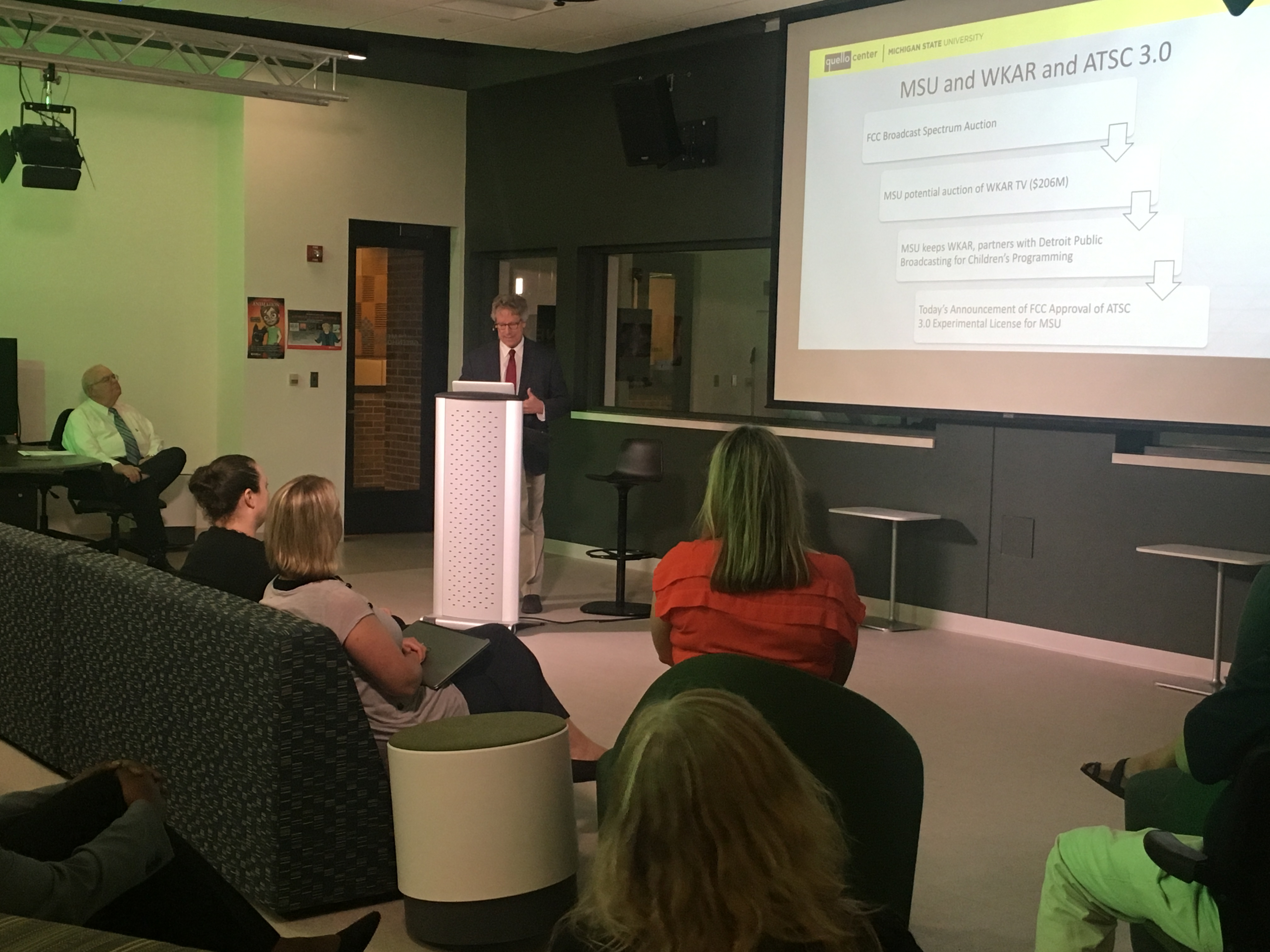 With the experimental license, WKAR studios and College of Com Arts will continue to build a state of the art ATSC 3.0 Media Innovation Lab. Dutton, who was part of a strong group that advocated to save MSU’s broadcast spectrum and establish a center at MSU to experiment with ATSC 3.0, explained the potential behind this cutting-edge broadcast system and reflected on how the university considered auctioning off WKAR-TV spectrum at the FCC Incentive Auction in 2016.