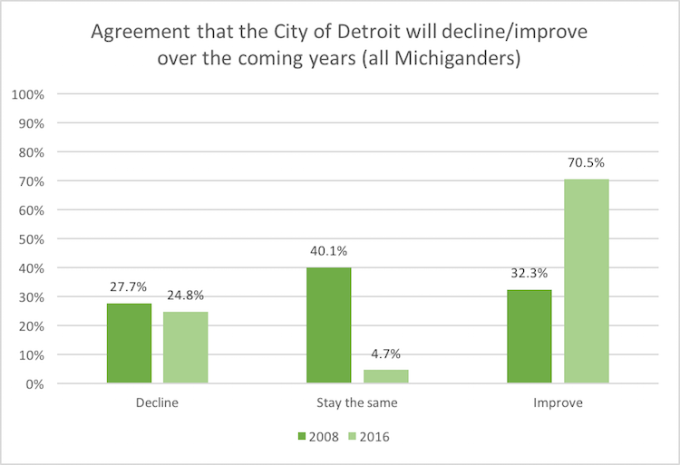 Moreover, Michigan residents are more positive about the future of Detroit in 2016 than in 2008, five years before the city of Detroit became the largest municipality in the United States to file for bankruptcy on July 18, 2013. In 2008, there was a more equal split among Michiganders, with 27.7% expecting the city to decline, and a slightly larger proportion (32.3%) expecting it to improve. Fully forty percent (40.1%) expected the city to stay in the same situation in 2008, compared to less than 5 percent in 2016. The drop in those expecting things to change might have declined due to a change in response categories, but opinion has clearly shifted to a more positive outlook for Detroit in the post-bankruptcy environment.