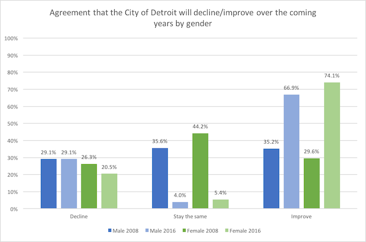 With respect to gender, Figure 3 shows that more women were pessimistic than men (29.6% of women thought things would improve, compared to 35.2% of men), and proportionately more women were likely to believe things would stay the same (44.2% of women, compared to 35.6% of men). However, by 2016, this had reversed, with 74.1 percent of women believing things would improve for Detroit, as compared with 66.9 percent of men. More men and women were optimistic in 2016, but the gain among women surpassed that among men (Figure 3).