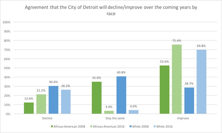 Figure 2 shows that in 2008, African American respondents were far more optimistic about the future of Detroit than were white respondents. For example, in 2008, 52% of African American respondents thought the city would improve, compared to only 28.7% of white respondents (Figure 2). From 2008 to 2016, there has been a dramatic increase in the proportion of more optimistic African American (52.6-75.4%) respondents, as well as white respondents (28.7-69.8%), leaving racial divides in attitudes about the city’s future less pronounced in 2016 than in 2008.